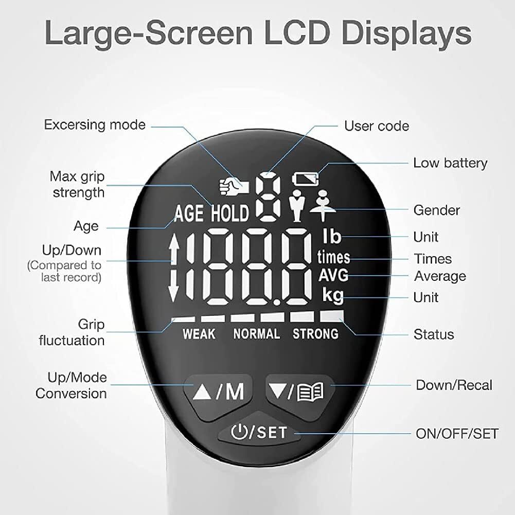Enhance your grip with our advanced digital grip trainer/meter, designed to withstand up to 90 kg (198 lbs). This device is the key to peak performance and takes your training to the next level with its user-friendly features and durable design.